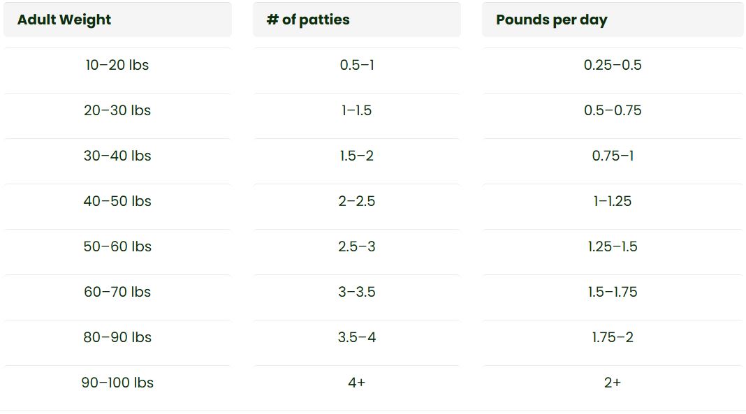 Puppies Feed them according to their estimated adult weight. Senior Dogs Feed 25% less than recommended. Overweight or Underweight Dogs Feed the amount according to their ideal target weight. Please note that feeding guidelines are approximate and may vary based on your pet’s individual needs. We recommend monitoring your pet’s body condition closely and adjusting their food intake as needed to maintain a healthy weight.