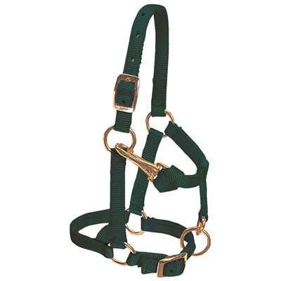 Sized perfectly for miniature horses, this 5/8" nylon halter features precise and even stitching and heat-sealed buckle holes. Brass plated hardware (except looped-on throat snap is non-rust solid brass).