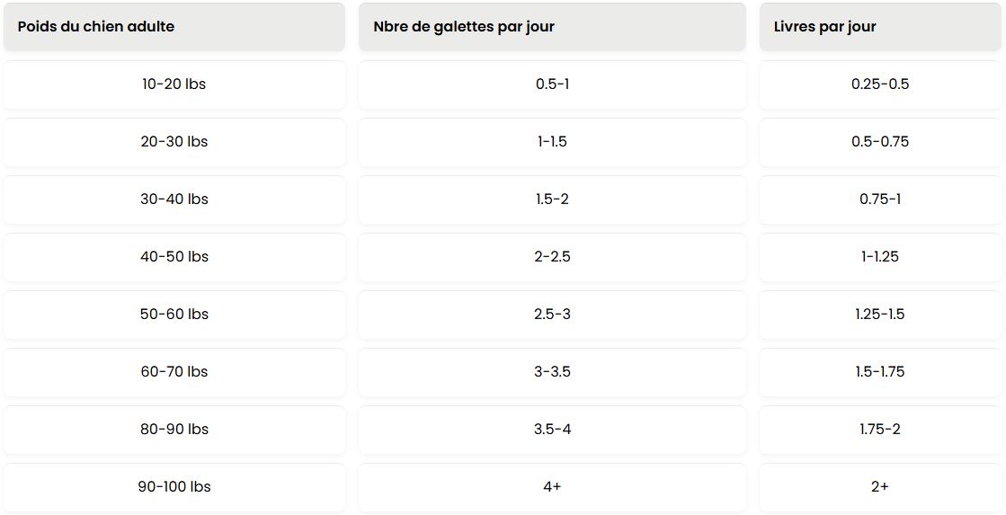 Veuillez noter que les quantités recommandées pour nourrir votre animal peuvent varier en fonction des besoins individuels de celui-ci. Nous vous recommandons de surveiller attentivement la condition physique de votre animal et d’ajuster sa ration alimentaire au besoin afin de maintenir un poids santé.