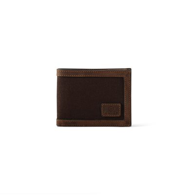 Portefeuille à deux volets de la marque Ariat. Ce portefeuille est doté d'un logo Ariat en cuir sur le devant. Bordure en cuir sur toute la longueur du portefeuille et incrustation de toile brun foncé. 6 fentes pour cartes de crédit et une pochette d'identification transparente.